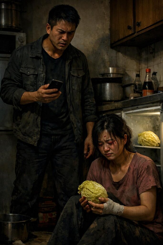 Trong tủ lạnh chỉ còn sót lại nửa cây bắp cải đã ngả vàng.