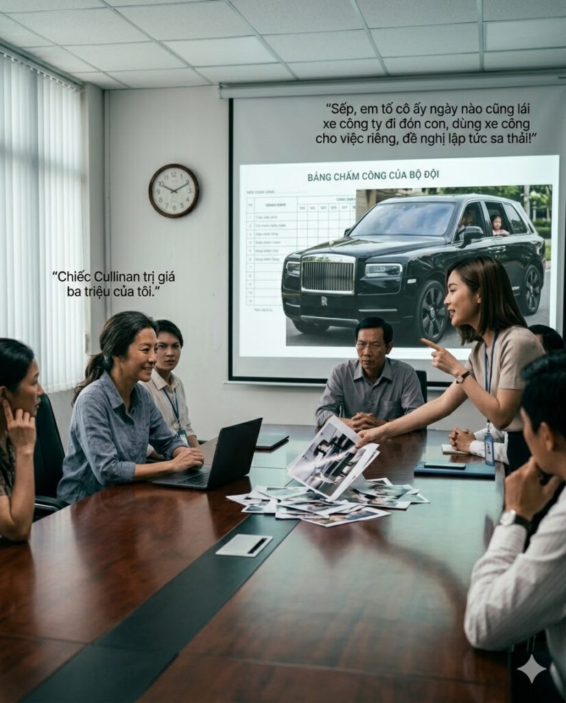 “Sếp, em tố cô ấy ngày nào cũng lái xe công ty đi đón con, dùng xe công cho việc riêng, đề nghị lập tức sa thải!”