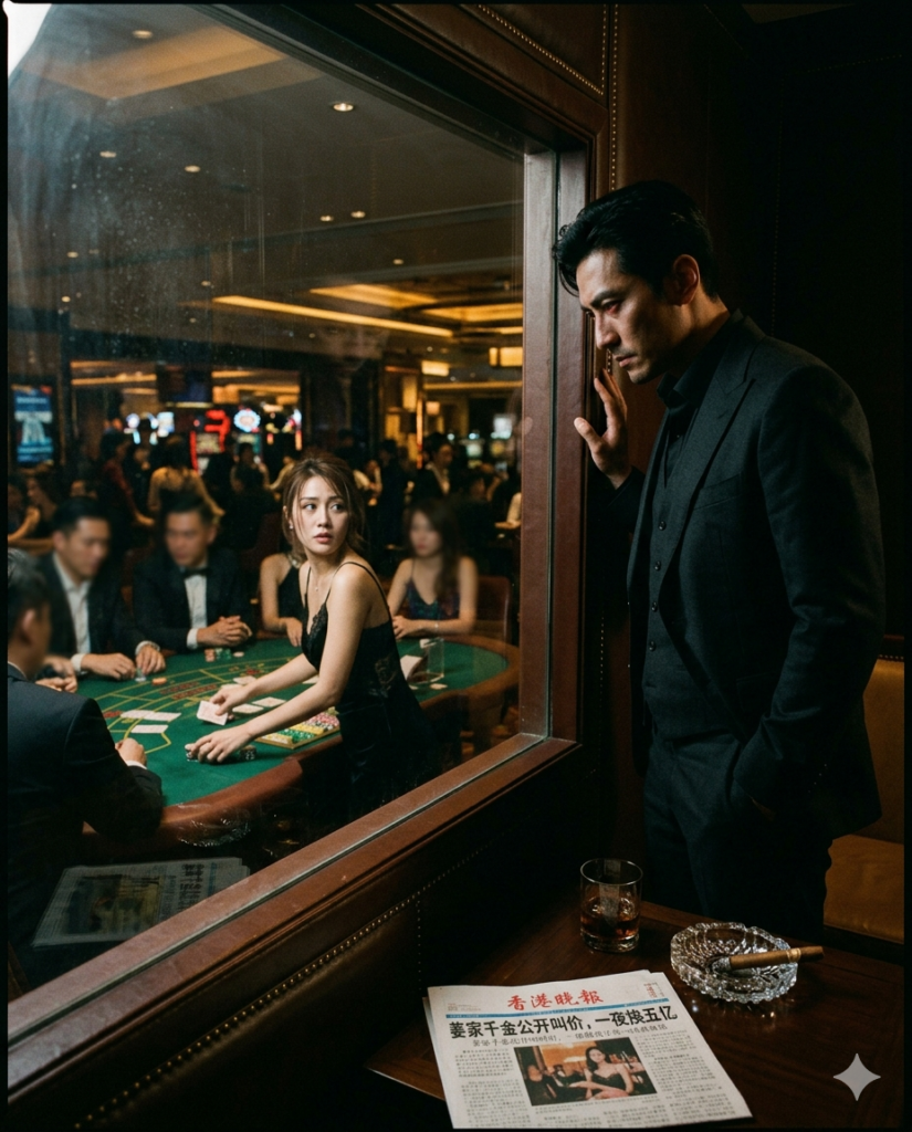 Bảy năm sau, tôi ăn mặc hở hang, đứng trước bàn bạc chia bài. Vừa ngẩng đầu lên, lại bắt gặp sau lớp kính phòng riêng đôi mắt đỏ ngầu ấy.