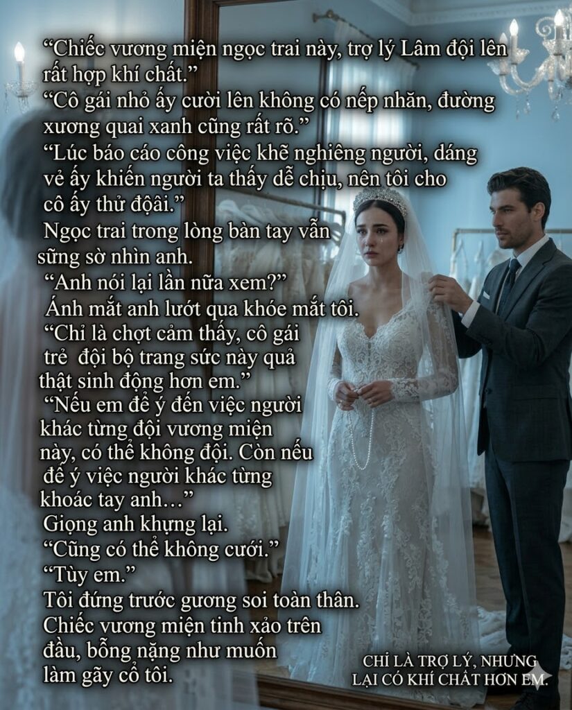 Khi tôi đang thử khăn voan cưới trong tiệm váy với Hạ Nghiễn Thanh, anh ta bỗng vô tình buột miệng nói một câu: