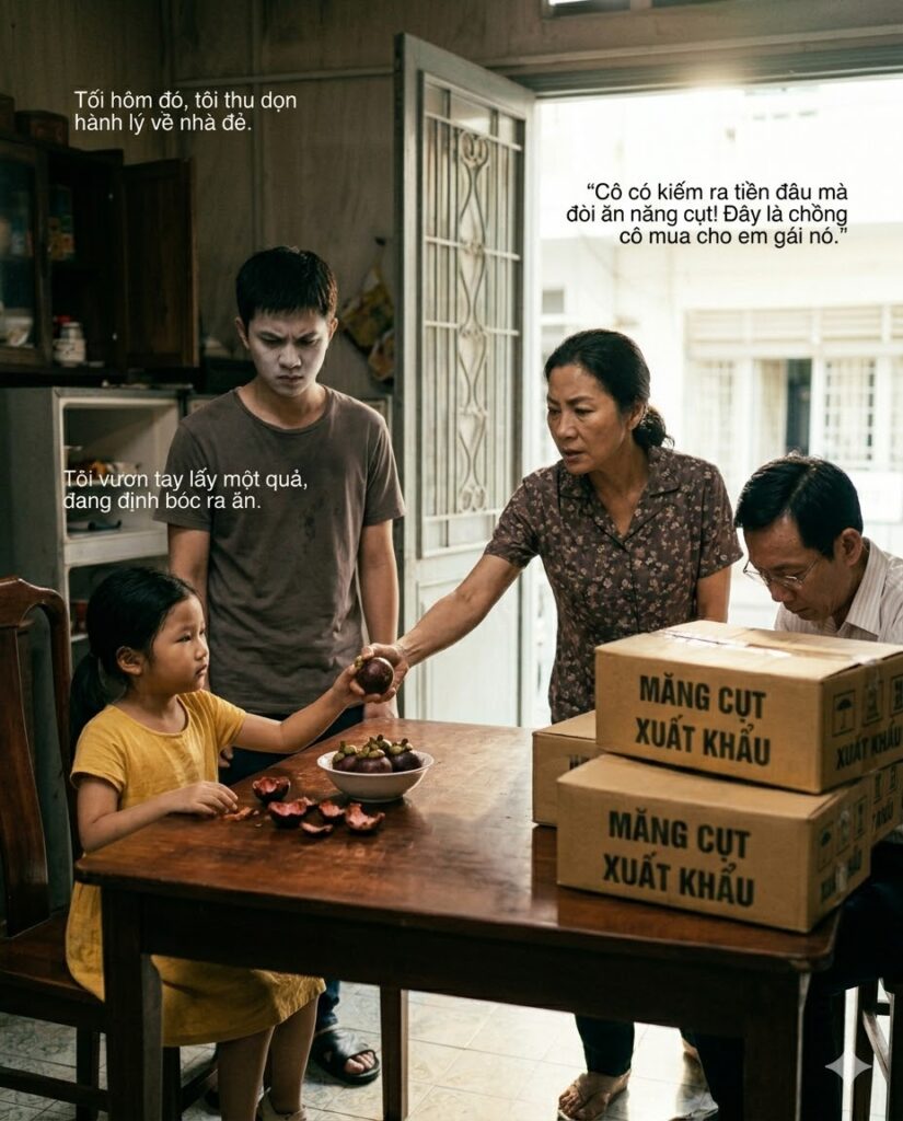 Tôi nhìn bốn thùng măng cụt đó, rồi nhìn lại khuôn mặt đầy vẻ hiển nhiên của mẹ chồng.